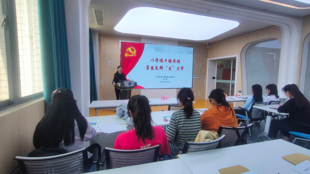 蒋艳以“以学促干强本领,勇当先锋‘生’力军”为主题开展专题党课。她首先强调了主题教育的总要求“学思想,强党性,重实践,建新功”,指出主题教育依托“三会一课”、主题党日等,各支部要着力抓好“九个一”,鼓励学员紧密结合日常学习科研、党团活动等形式,切实推动主题教育往深里走、往实里走、往心里走。
