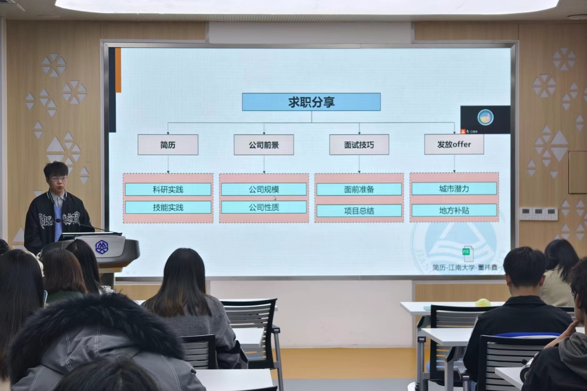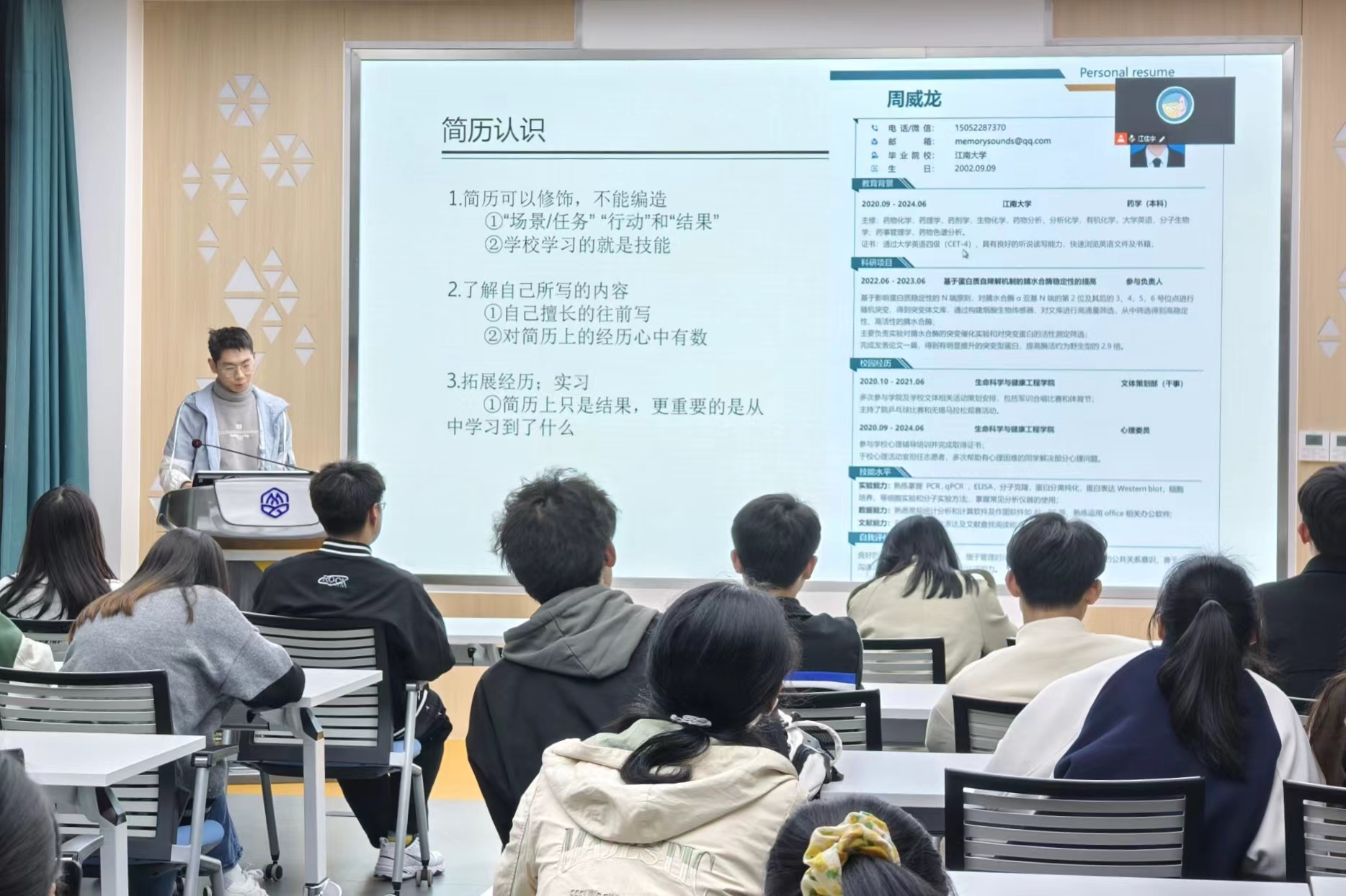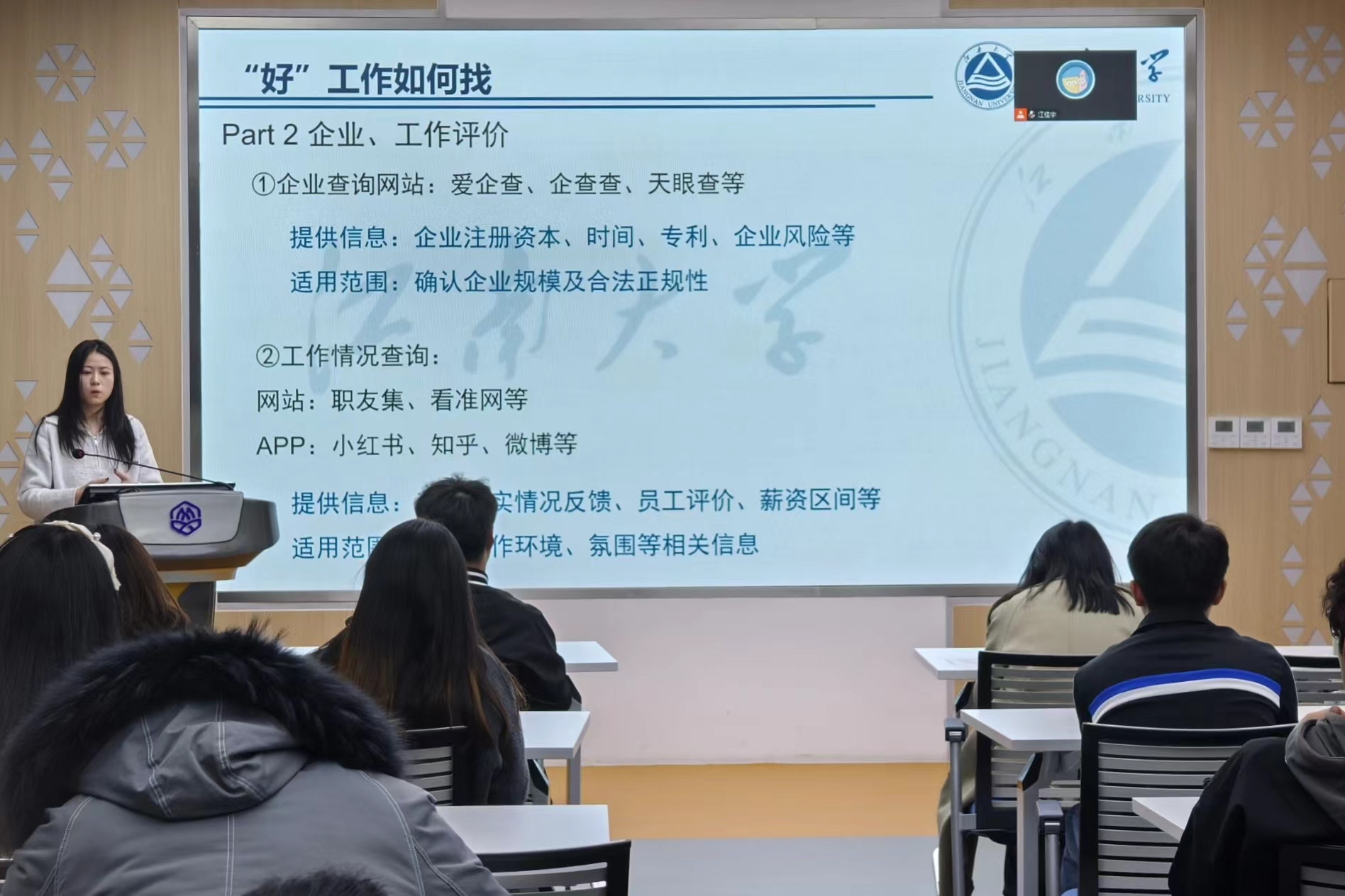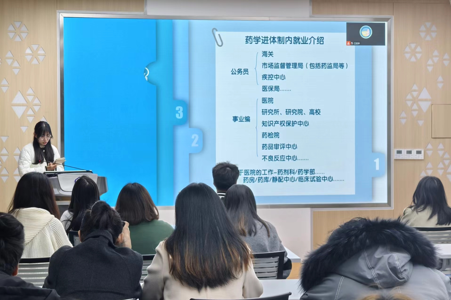 药学20硕的卢歌雪学姐结合在校期间与工作期间的经历,分享在校经历对职场之路的影响,为学弟学妹提供更好的在校规划与职场成长之路,通过“好工作的标准是什么”以及“如何寻找工作信息”,为学弟学妹们分享了满满的干货。