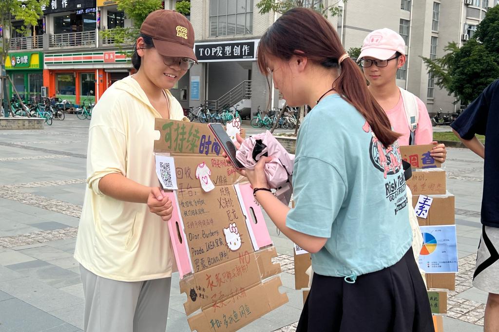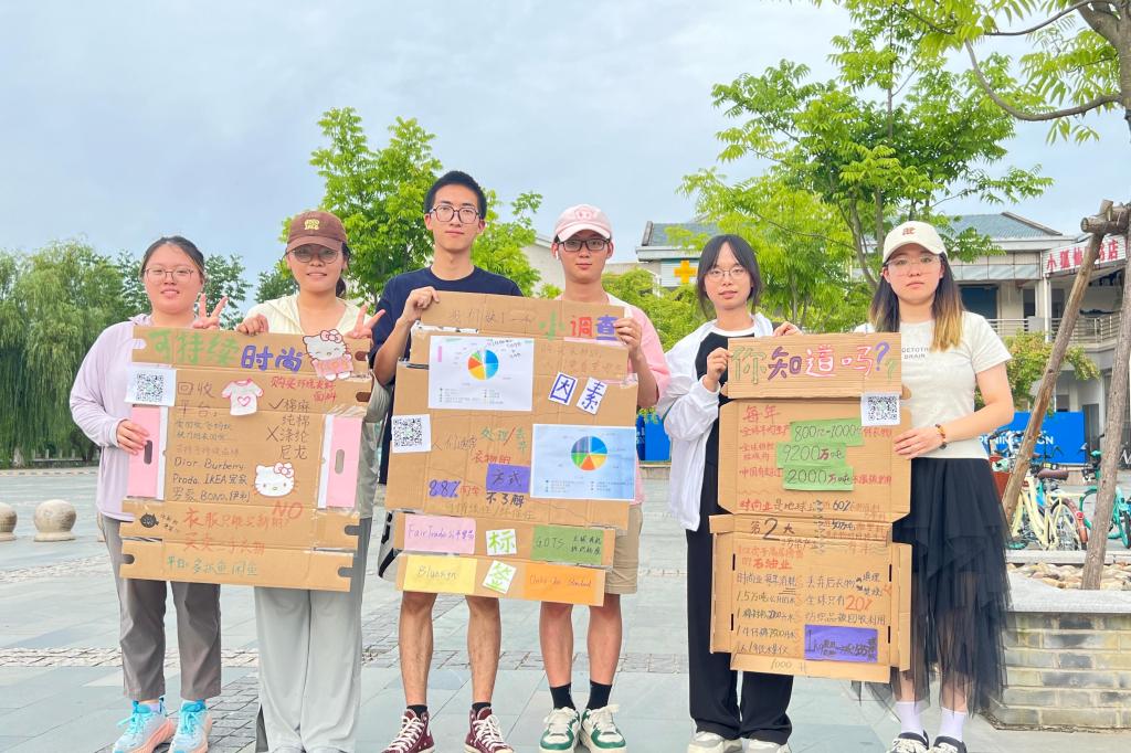 青春之青,绿色之行。为了提高同学们的环保意识,树立绿色循环的理念,青春“绿”动实践团围绕旧衣物回收利用主题展开调查与分析,并收集废旧纸板、包装袋等制作主题展板,在2138cc太阳集团校园内开展快闪活动,吸引许多同学驻足观看。