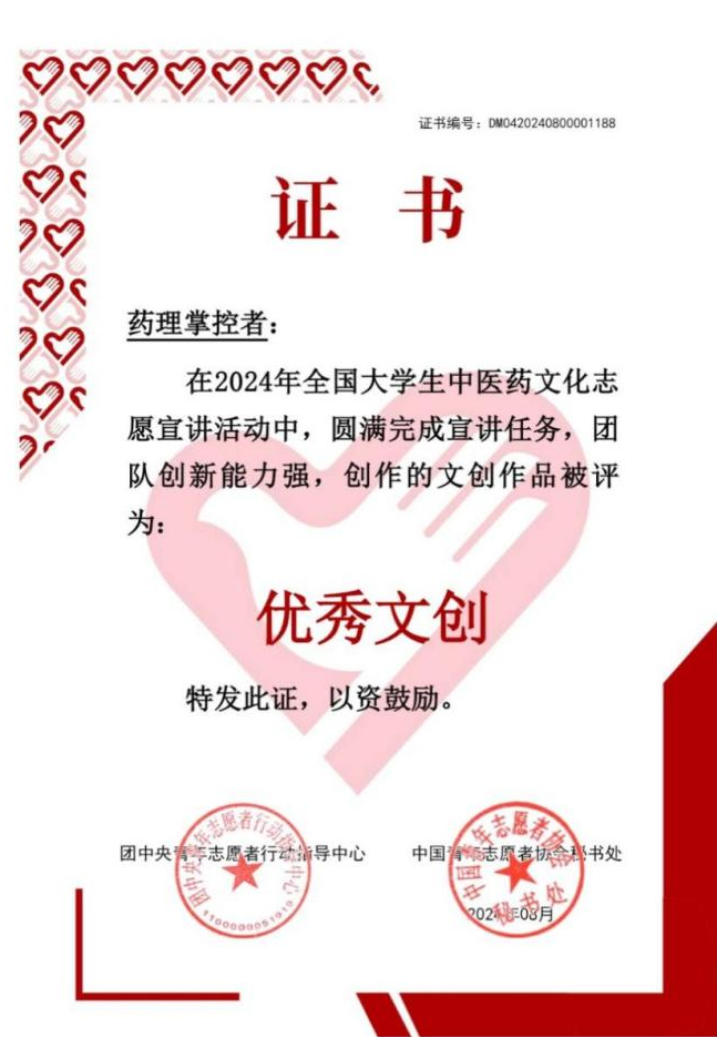 2023年12月,团中央青年志愿者行动指导中心、中国青年志愿者协会秘书处等部门面向全国高校遴选出1000支大学生志愿服务团队宣扬中医药文化。近日,协会遴选公布了2024年全国大学生中医药文化精神志愿宣讲活动的100支优秀团队及100个优秀文化创意成果。我院“药理掌控者”中医药志愿宣讲团圆满完成宣讲任务,团队制作的中医药文化创意产品被评选为“优秀文创”,充分展现了生科学子的实践能力和青春风采。