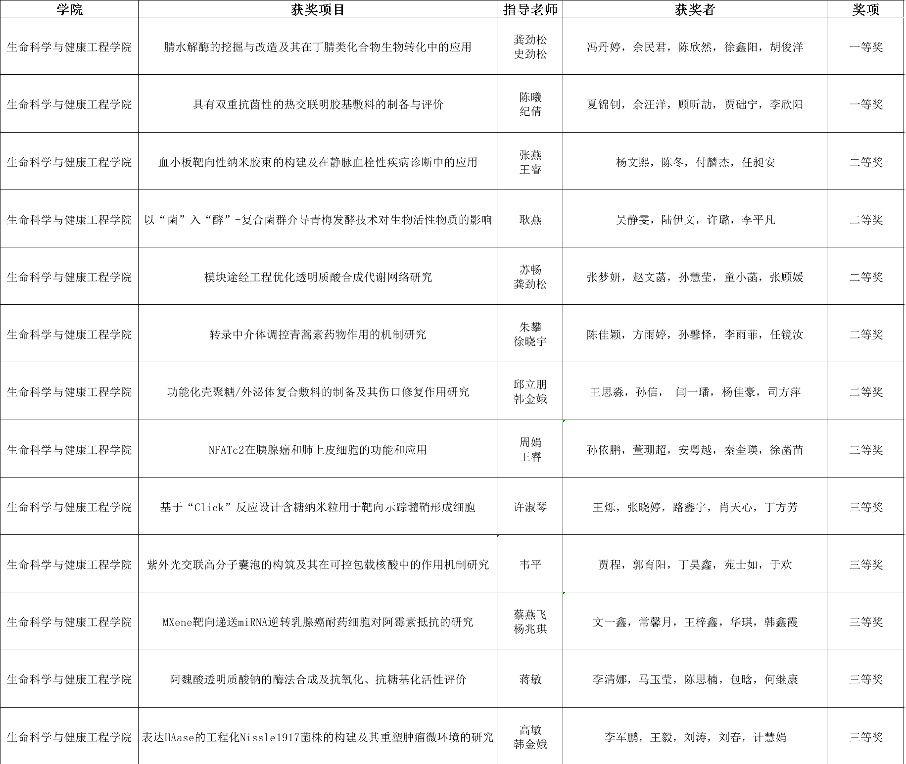 龚劲松、史劲松老师指导,冯丹婷、余民君、陈欣然、徐鑫阳、胡俊洋同学参赛的项目《腈水解酶的挖掘与改造及其在丁腈类化合物生物转化中的应用》,陈曦、纪倩老师指导,夏锦钊、余汪洋、顾昕劼、贾础宁、李欣阳同学参赛的项目《具有双重抗菌性的热交联明胶基敷料的制备与评价》荣获省赛一等奖
