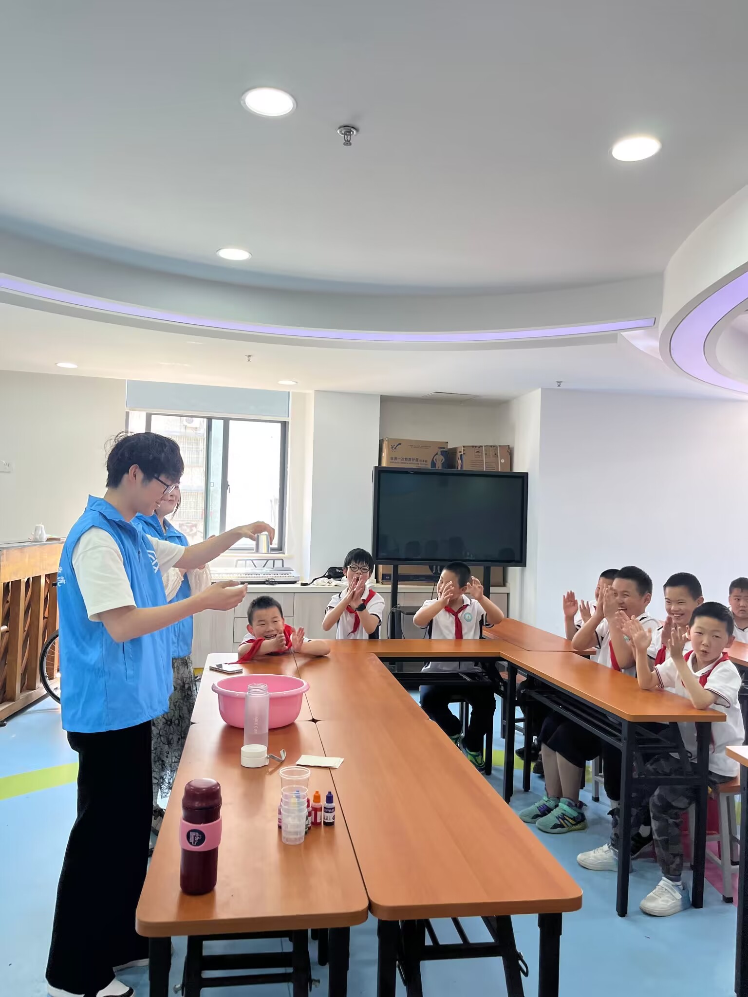 活动在进行到“杯子倒放水不流”时达到高潮。同学们展示后,小朋友们纷纷上台尝试,尽管手紧张到颤抖,但他们从不轻言放弃,一次次失败,又一次次努力,终于,他们成功了,这一刻“星星”的光辉绽放,所有人无不为其鼓掌。
