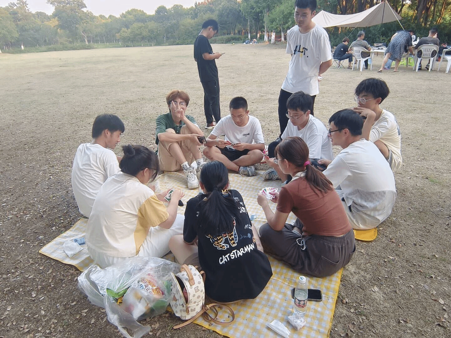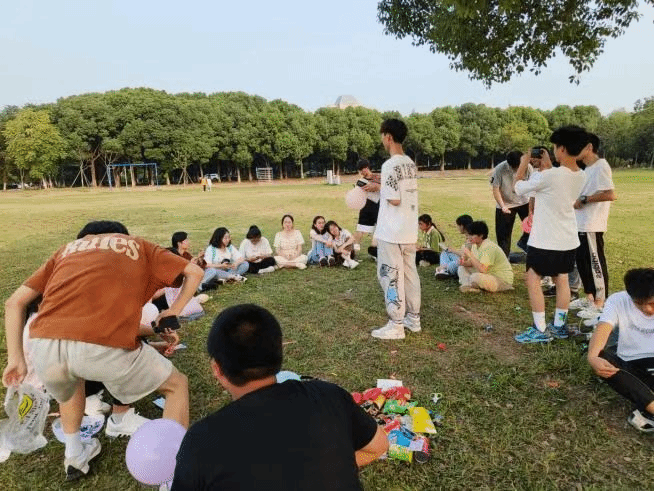 当日下午14时,药学2201班的同学们在贡湖湾湿地公园集合,班委们提前搭好吊扇,准备完烧烤架。负责烧烤的同学专心做出佳肴,其余的同学在组织委员和心理委员的带领下有条不紊地开展不要做挑战和UNO牌等游戏。大家各显神通,绞尽脑汁地取得胜利。文体委员弹奏吉他,用音乐作为粘合剂,来为游戏的进行增添氛围感。欢笑声此起彼伏,预示着活动的圆满成功。