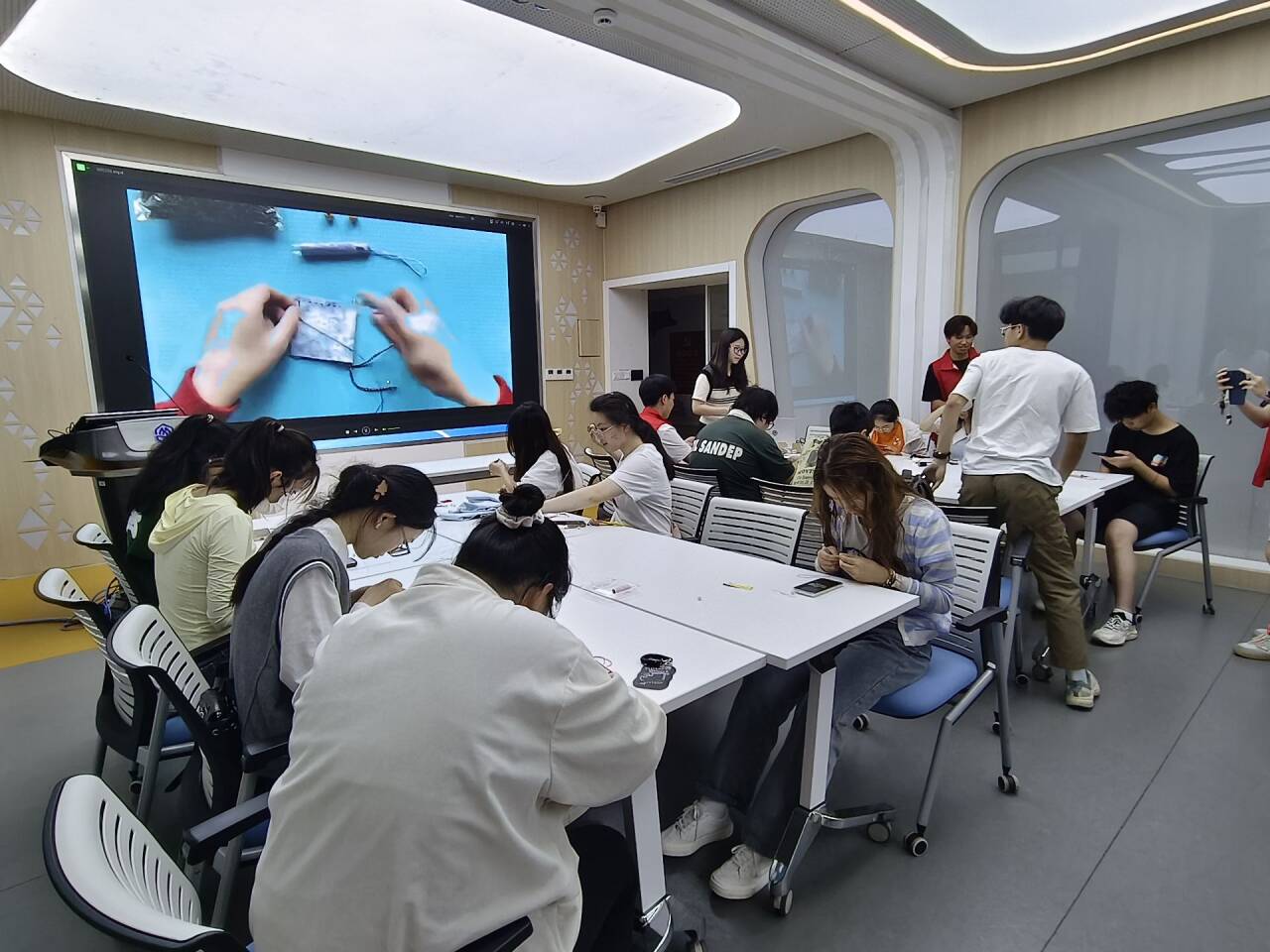 接着,为了让大家更清晰的明确制作香囊的具体操作,同学们一起观看了香囊手工制作的教学视频,同学们都听的非常仔细,有的用手机拍照,有的用笔做笔记,将具体的手法步骤记录下来。