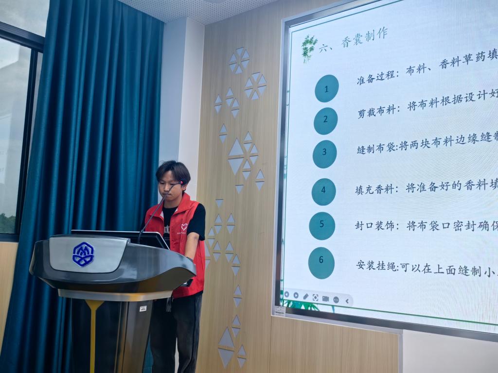 活动伊始,来自生科院药理掌控者团队的松泽亮同学首先向大家介绍了几种代表性的中草药及其作用,包括艾草、薄荷、薰衣草、苍术等等,同时,也向同学们介绍了中草药香囊的历史起源与作用以及在中国传统文化中的重要地位。随后详细讲解了香囊的制作步骤和技巧,包括布料的选择、图案的设计、针线的使用等。同学们认真聆听香囊的制作步骤,不时提问交流,现场生科院药理掌控者团队的志愿者积极解惑答疑,现场氛围十分活跃。